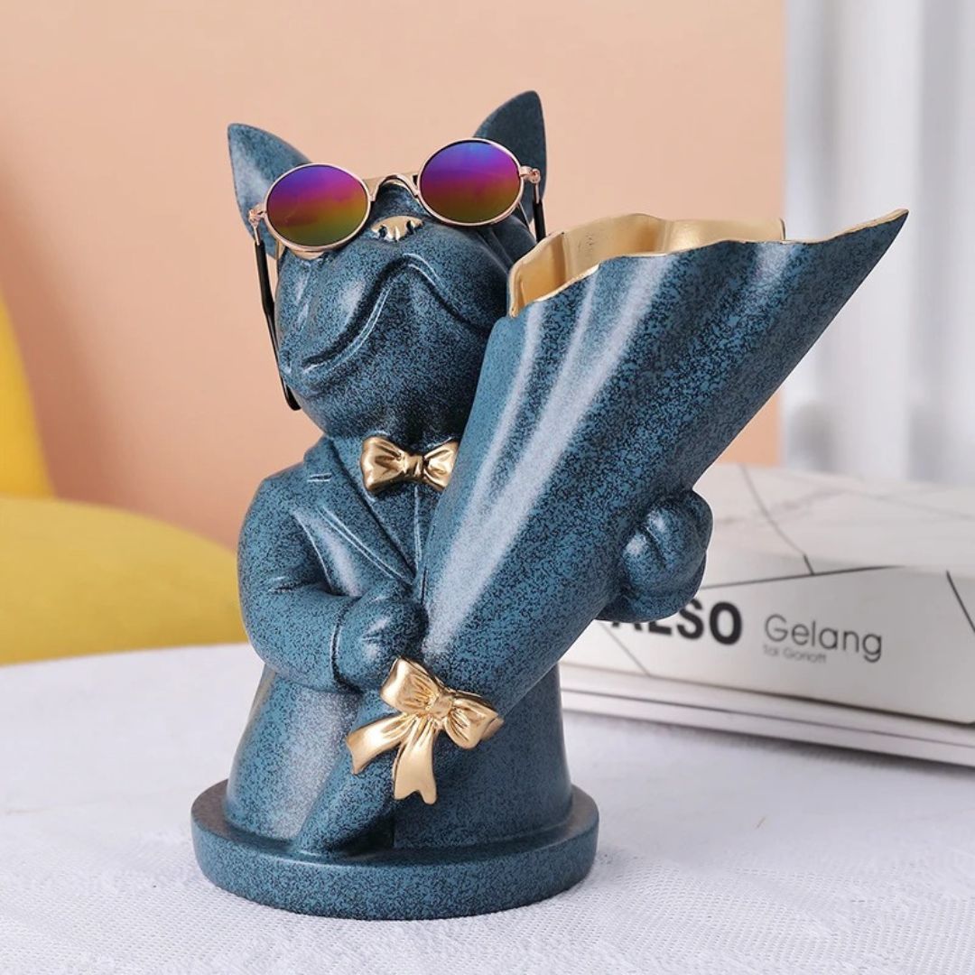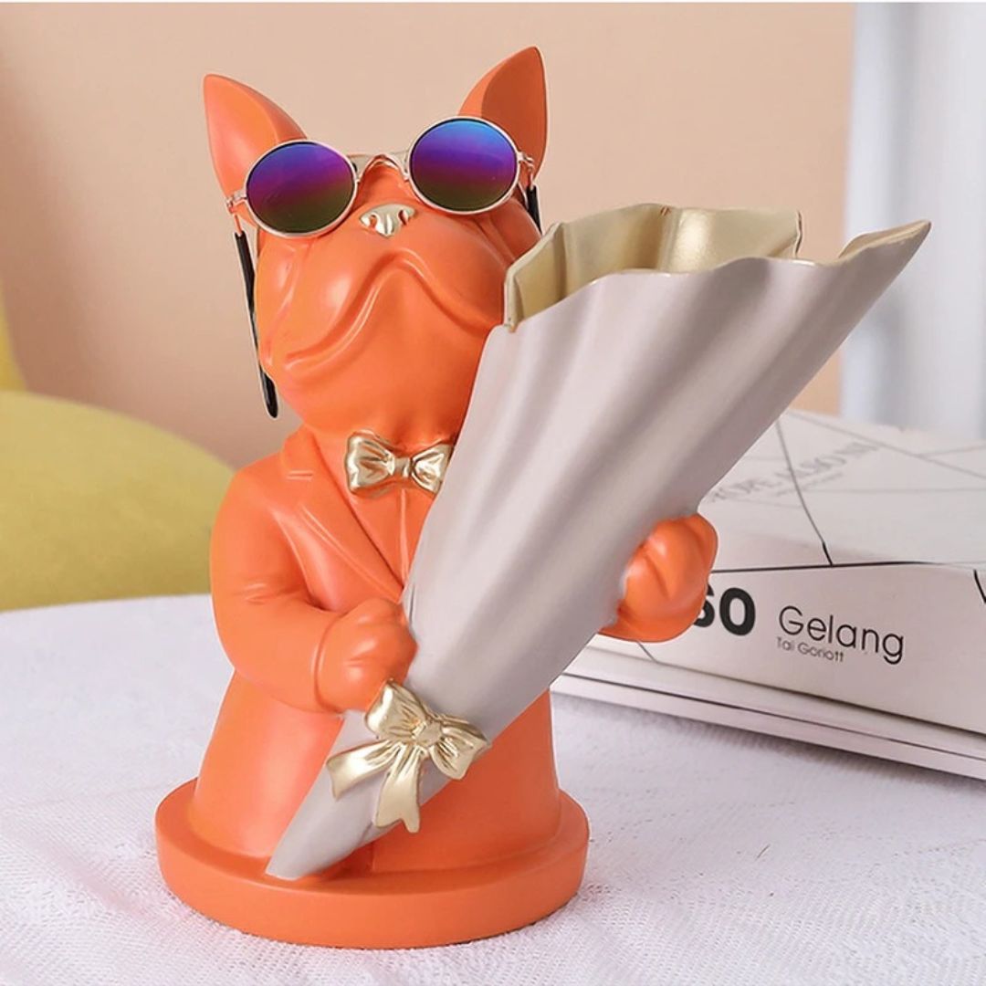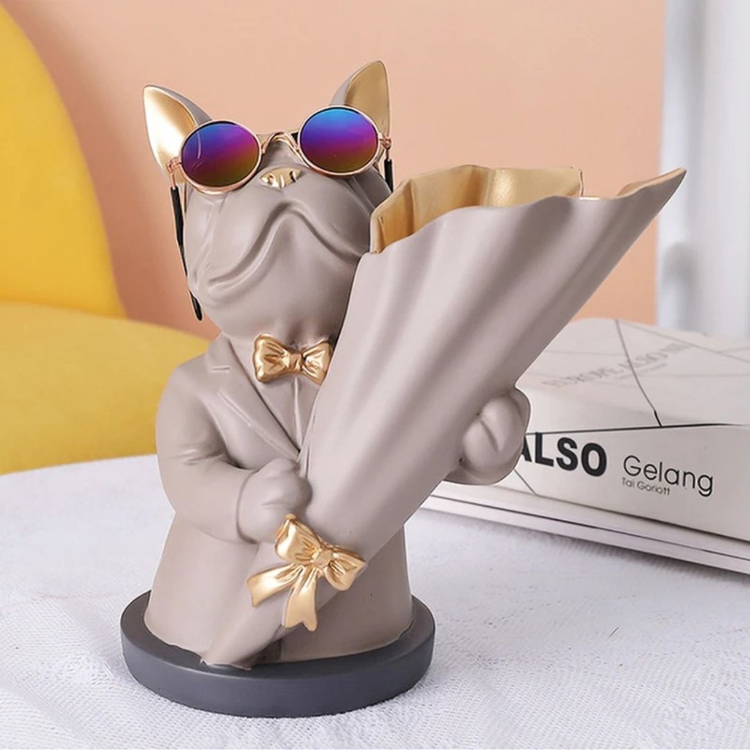 Détails Méticuleux : La figurine présente un bouledogue français avec des détails réalistes, tenant délicatement un vase à fleurs, ajoutant une touche de grâce et de poésie à votre espace.