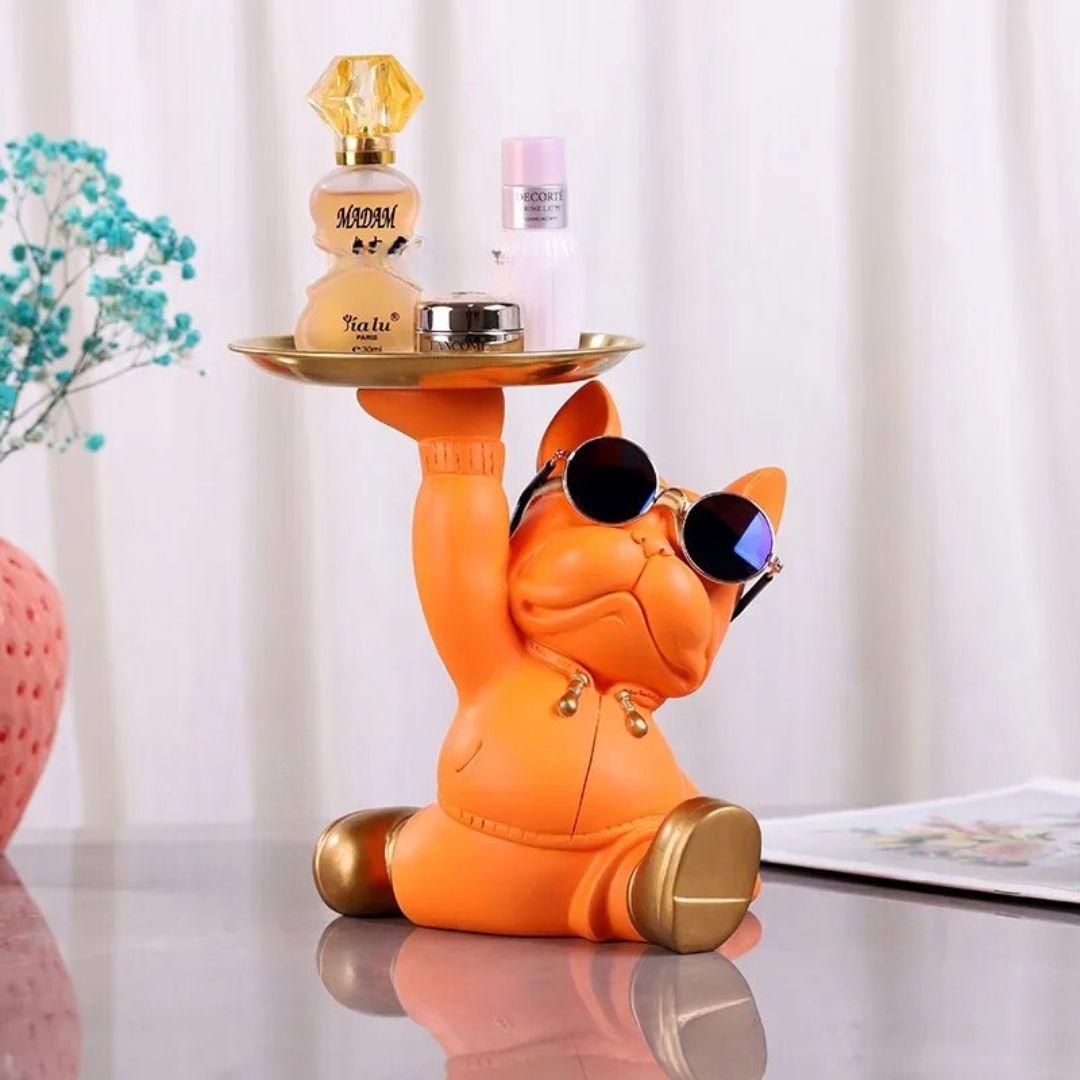 Majordome Astucieux : La figurine représente un bouledogue français agissant en tant que majordome, ajoutant une dose d’humour et de charme à votre intérieur.