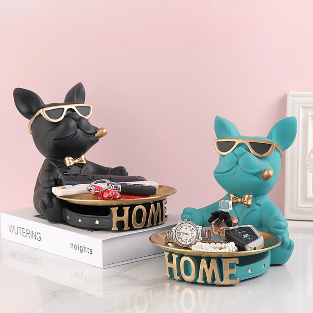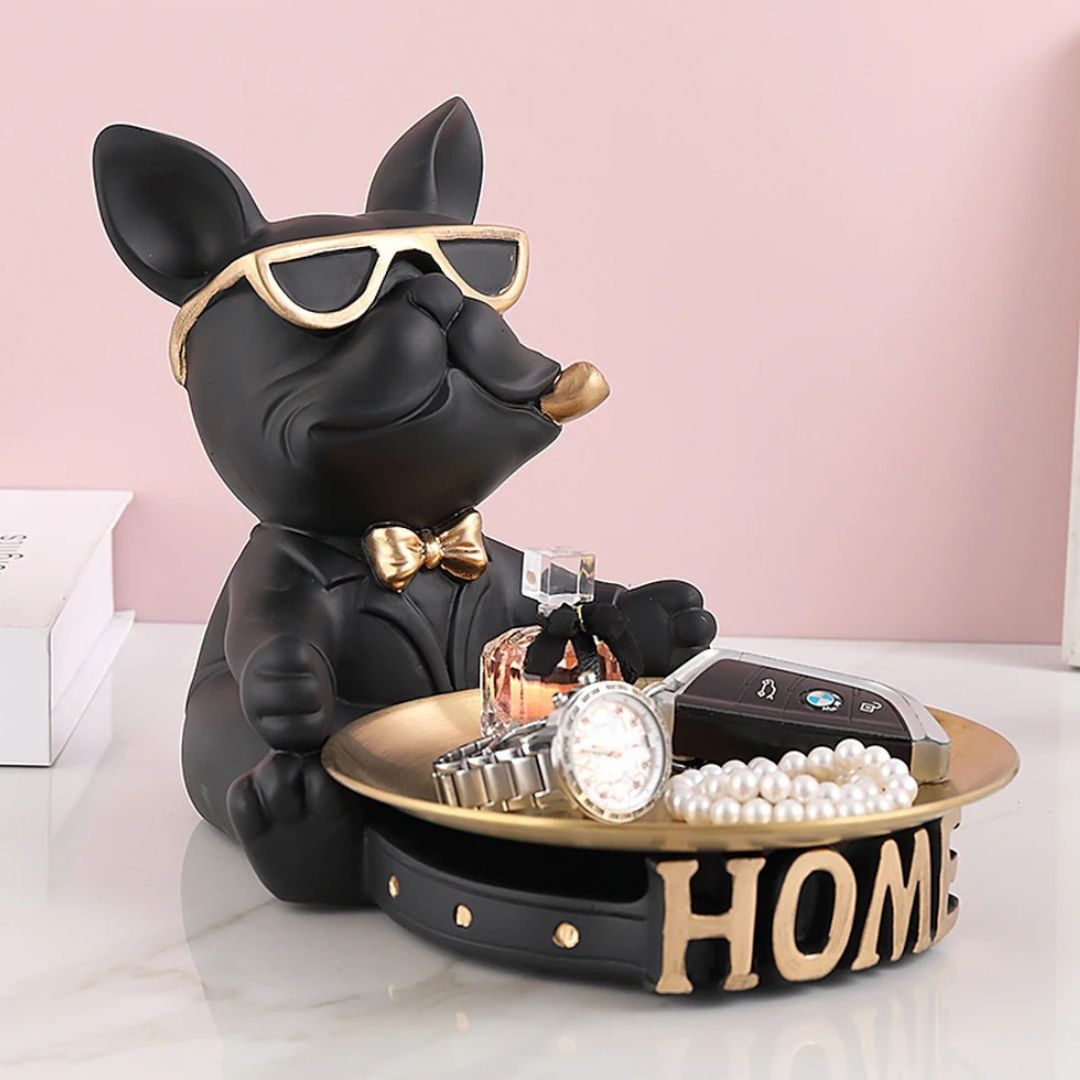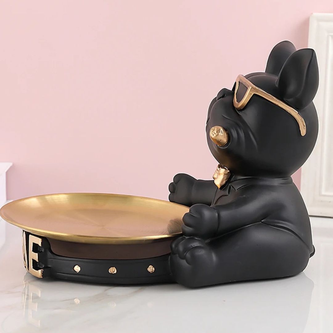 Rencontrez votre nouvel assistant domestique : le “Majordome Canin”, une statue en résine artistique qui allie utilité et charme. Avec son air sophistiqué et ses lunettes tendance, ce bouledogue français est plus qu’une simple décoration. Il sert de support pratique avec son plateau métallique intégré, parfait pour garder vos objets essentiels à portée de main tout en ajoutant une touche de style à votre espace.