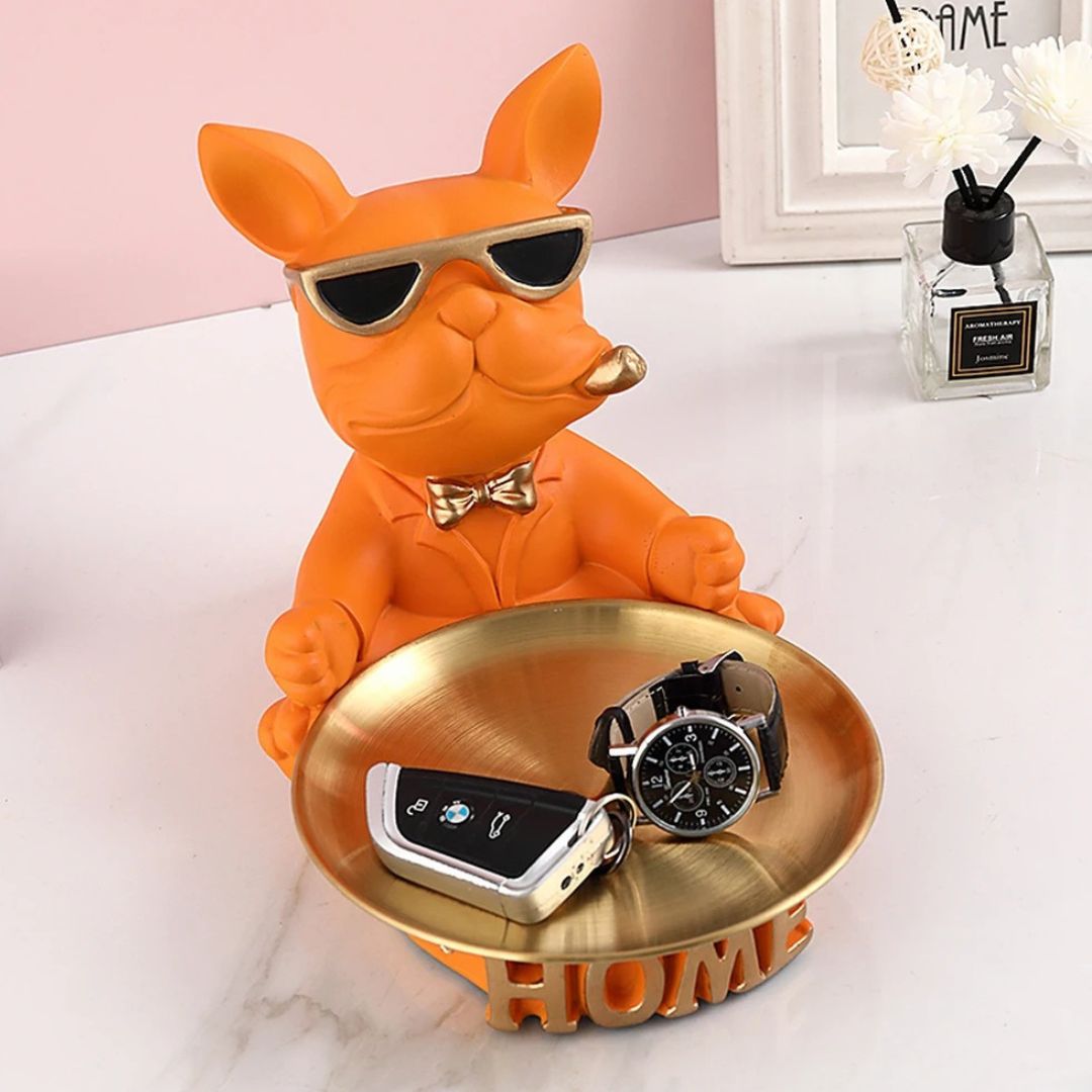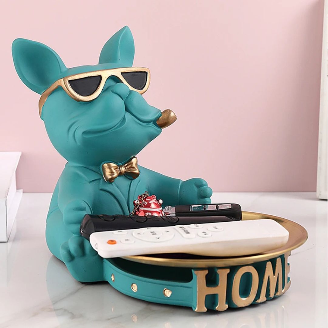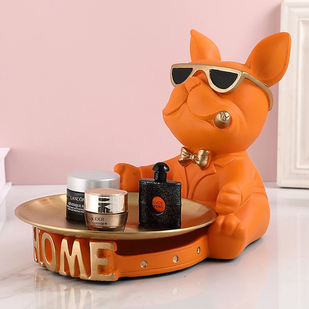 Rencontrez votre nouvel assistant domestique : le “Majordome Canin”, une statue en résine artistique qui allie utilité et charme. Avec son air sophistiqué et ses lunettes tendance, ce bouledogue français est plus qu’une simple décoration. Il sert de support pratique avec son plateau métallique intégré, parfait pour garder vos objets essentiels à portée de main tout en ajoutant une touche de style à votre espace.