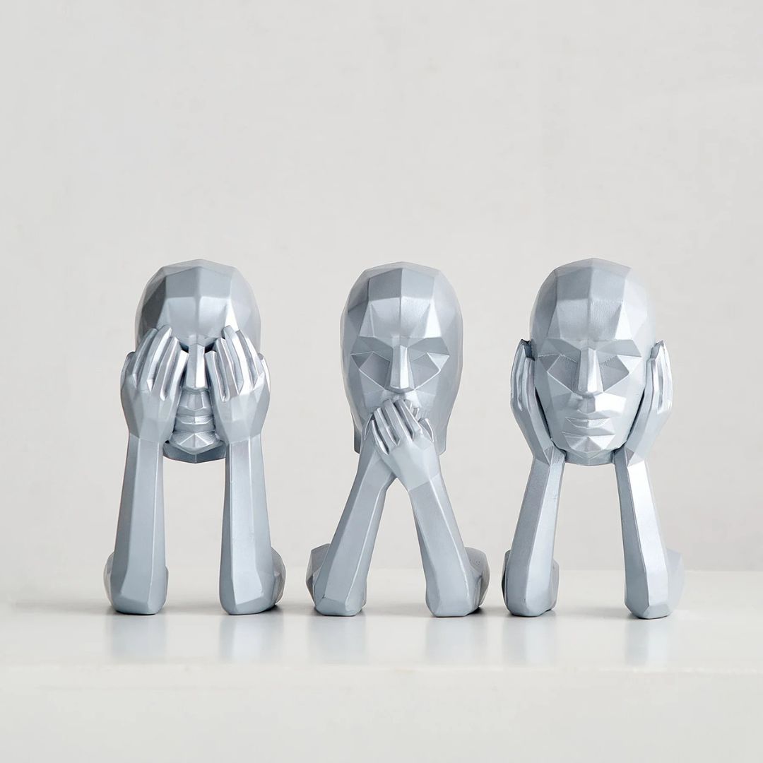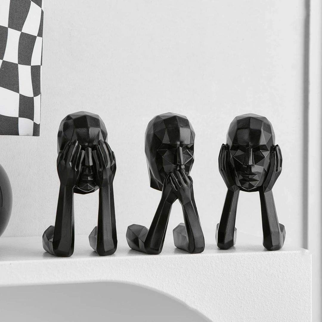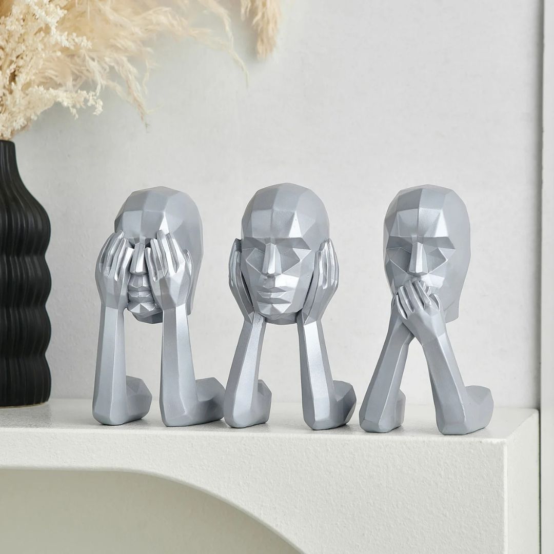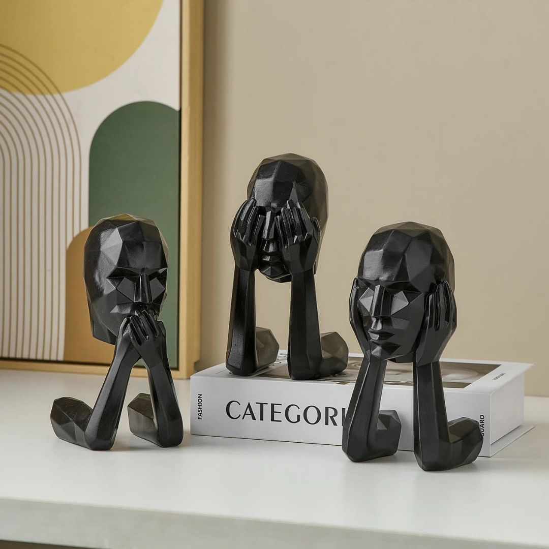 Présentant un design moderne et expressif, le Trio de Statues “Pensées Contemporaines” est un ajout artistique à tout espace de vie ou bureau. Ces sculptures en résine incarnent les trois singes de la sagesse d’une manière stylisée et géométrique, chacune capturant une posture classique : “Ne rien voir, ne rien entendre, ne rien dire”.