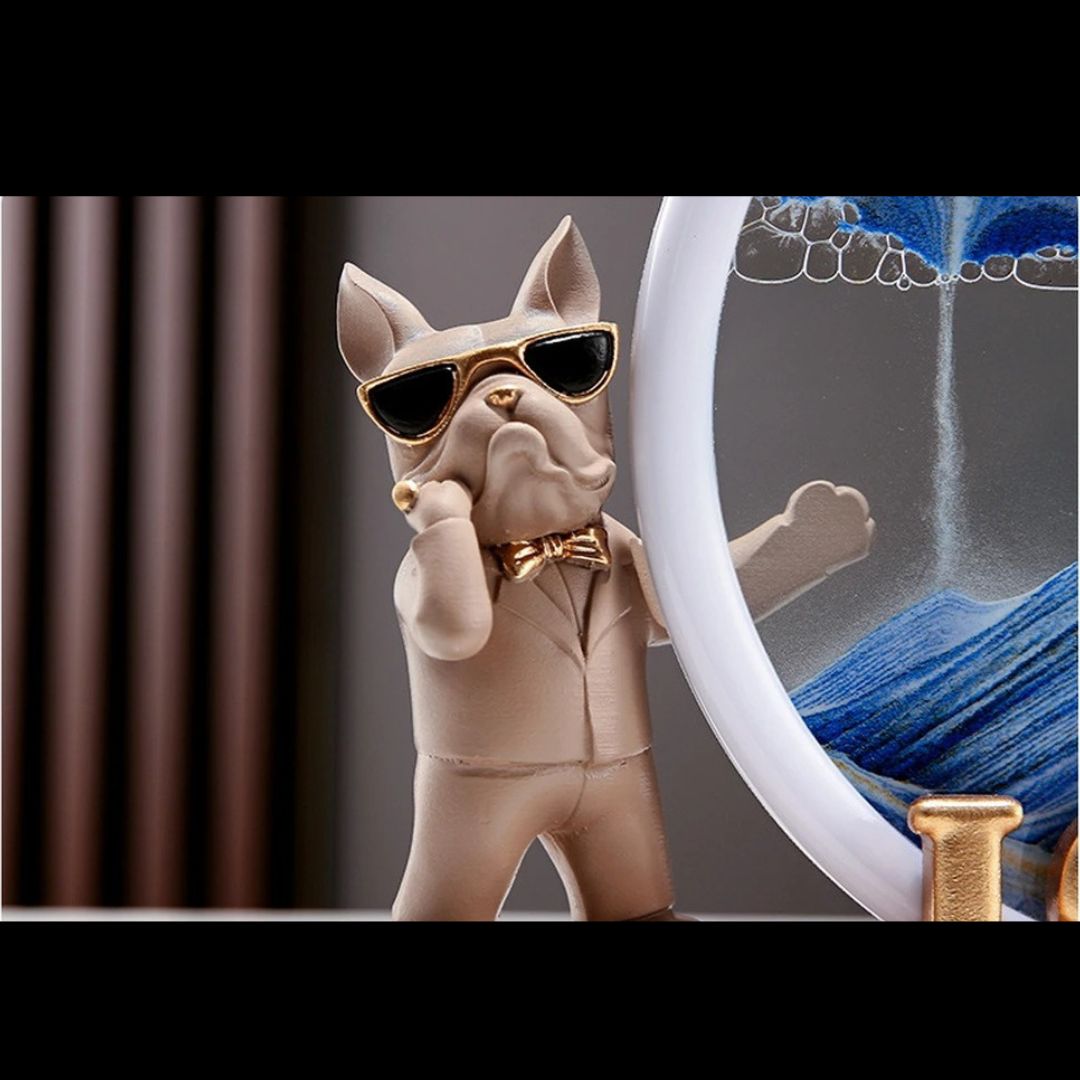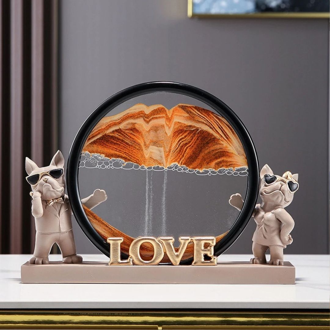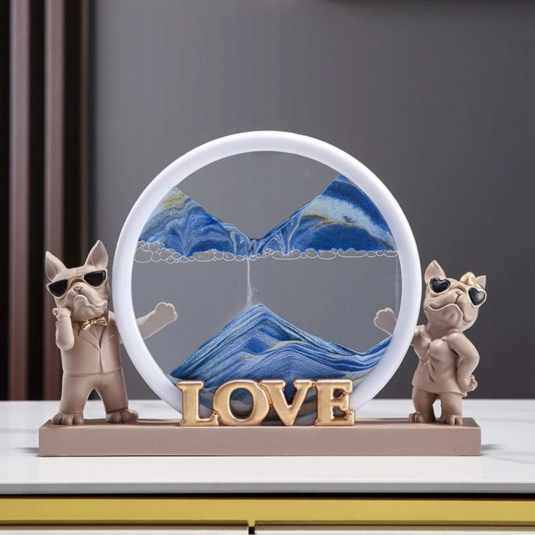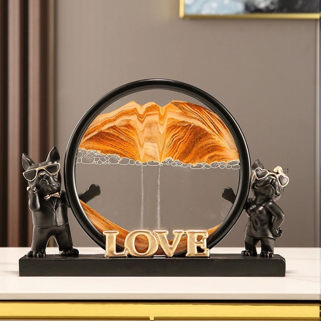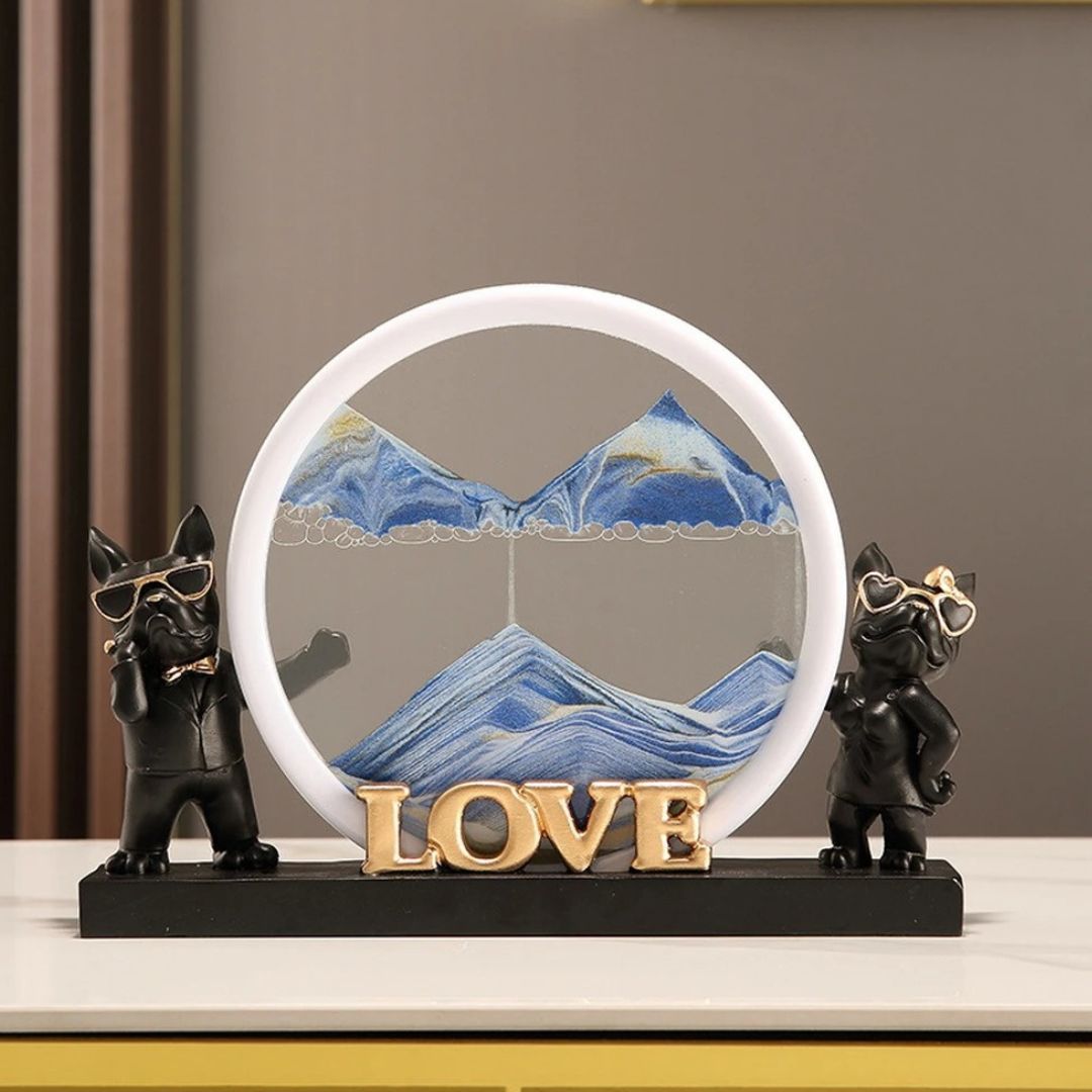 Cet ensemble décoratif saisissant, baptisé “Guardians of Love”, capture la dynamique du temps et l’essence de l’amour. Deux chiens, l’un paré de lunettes de soleil classiques et l’autre orné de lunettes en forme de cœur, sont les gardiens d’un sablier mystique qui évoque les dunes changeantes d’un désert lointain. La pièce centrale, le mot “LOVE” en caractères dorés, est posée au pied de ce tableau vivant, ajoutant une touche d’éclat.
